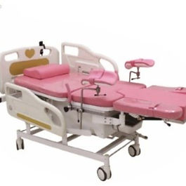 Cama de parto quirúrgica eléctrica con mando alámbrico, múltiples posiciones, barandales ABS y ruedas con freno centralizado.